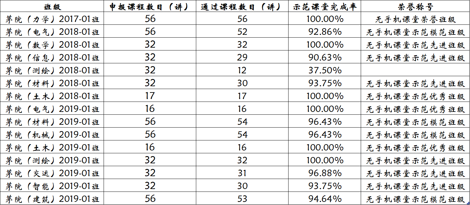 在线赌场 第七期无手机课堂示范班活动已于2019-2020学年第一学期圆满完成,且取得了较好的实践效果,现根据《西南交通大学在线赌场 无手机课堂示范班管理办法》, 将各班级所获荣誉称号情况公示如下。